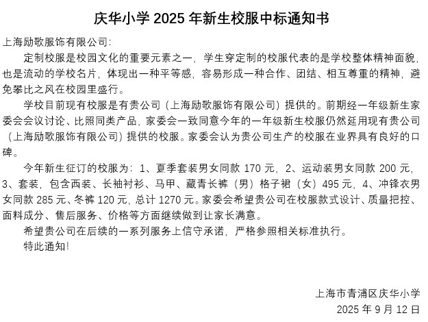 庆华小学2025年校服征订公示