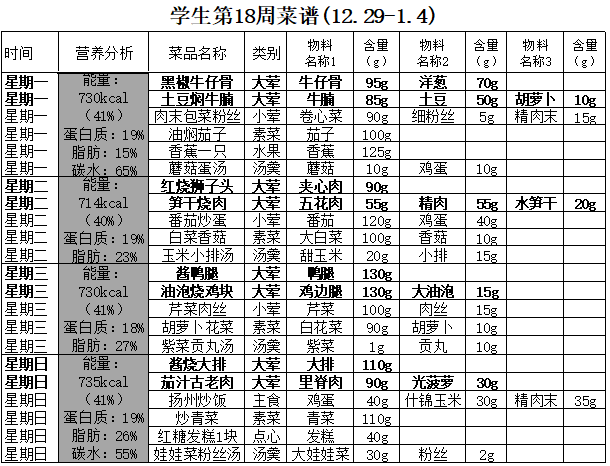 2025学年第一学期第18周学生菜谱