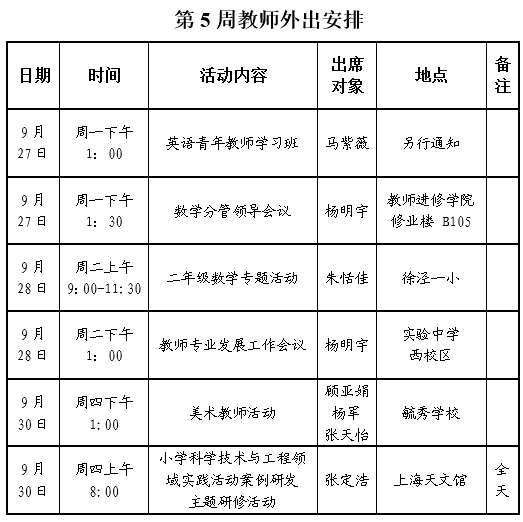2021学年第一学期第5周学校工作、教师外出及看护安排