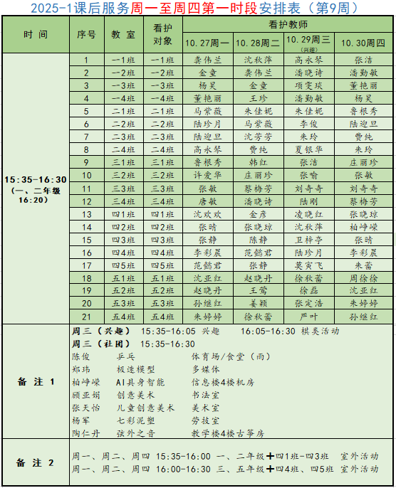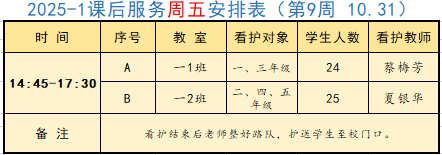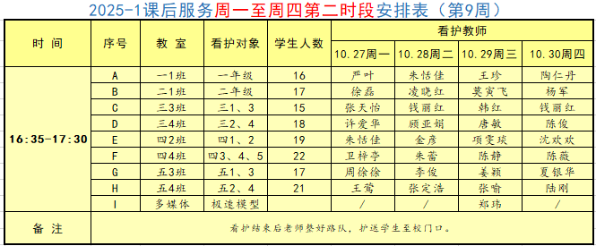 2025学年第一学期第9周学校工作、教师外出及看护安排