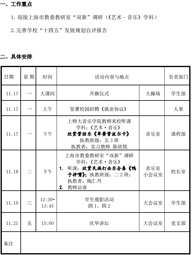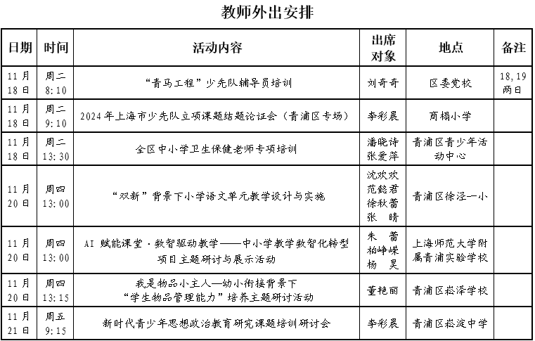 2025学年第一学期第11周学校工作、教师外出及看护安排