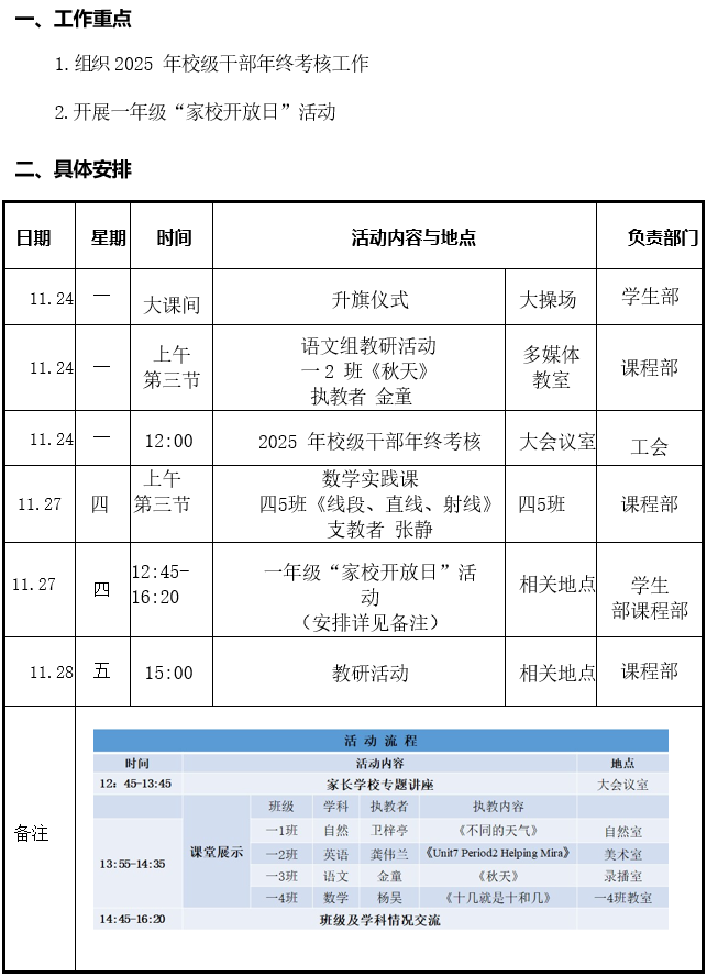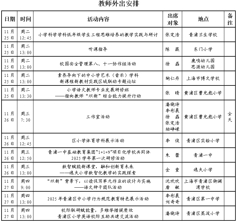 2025学年第一学期第11周学校工作、教师外出及看护安排