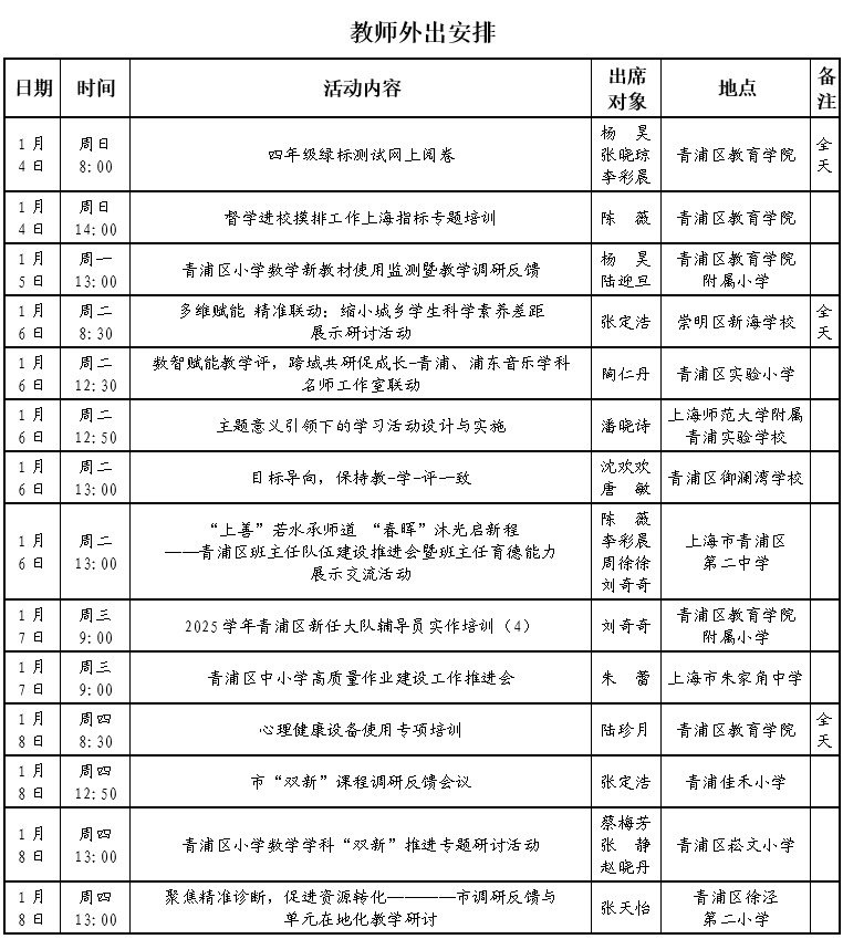 2025学年第一学期第18周学校工作、教师外出及看护安排